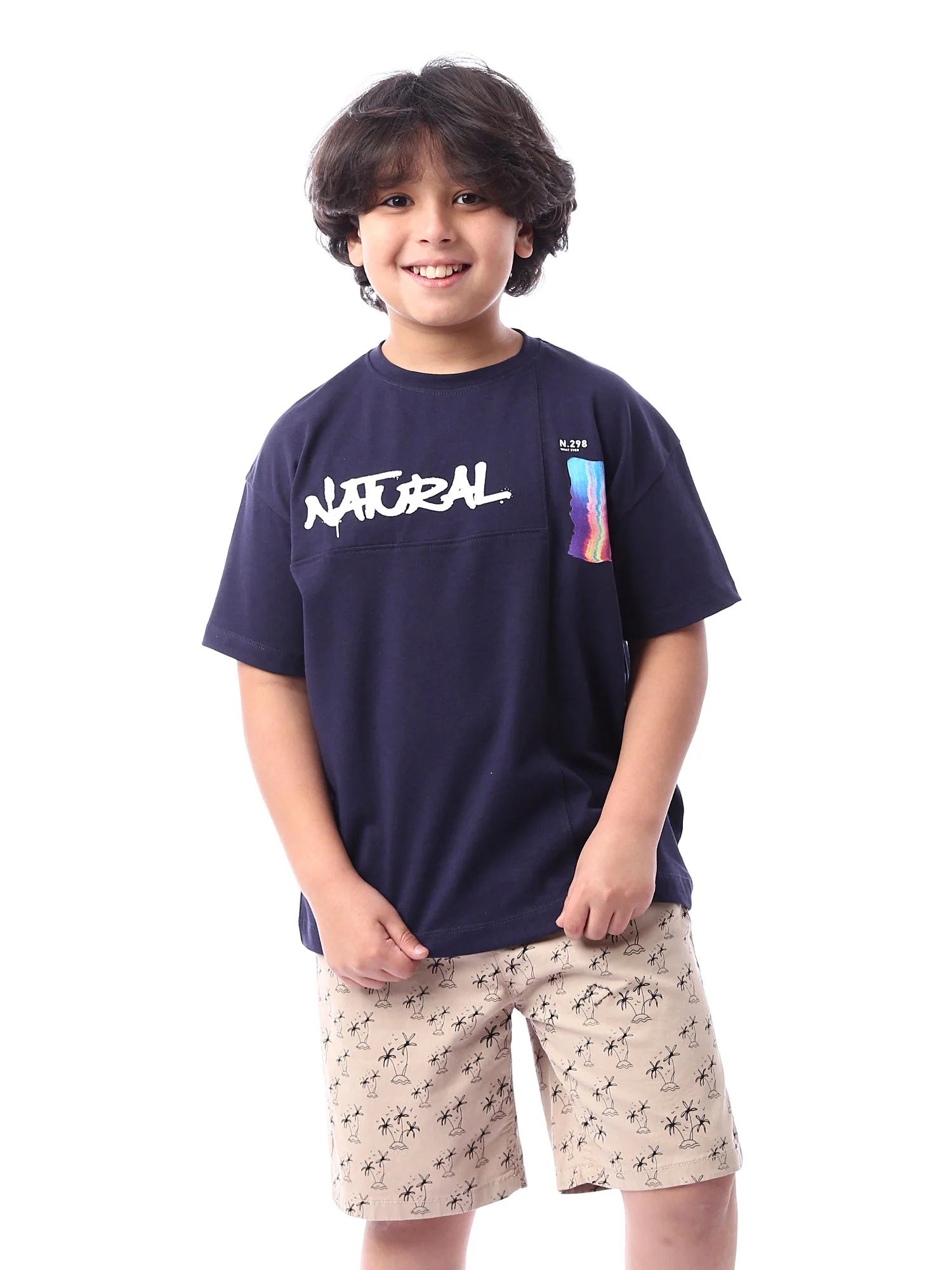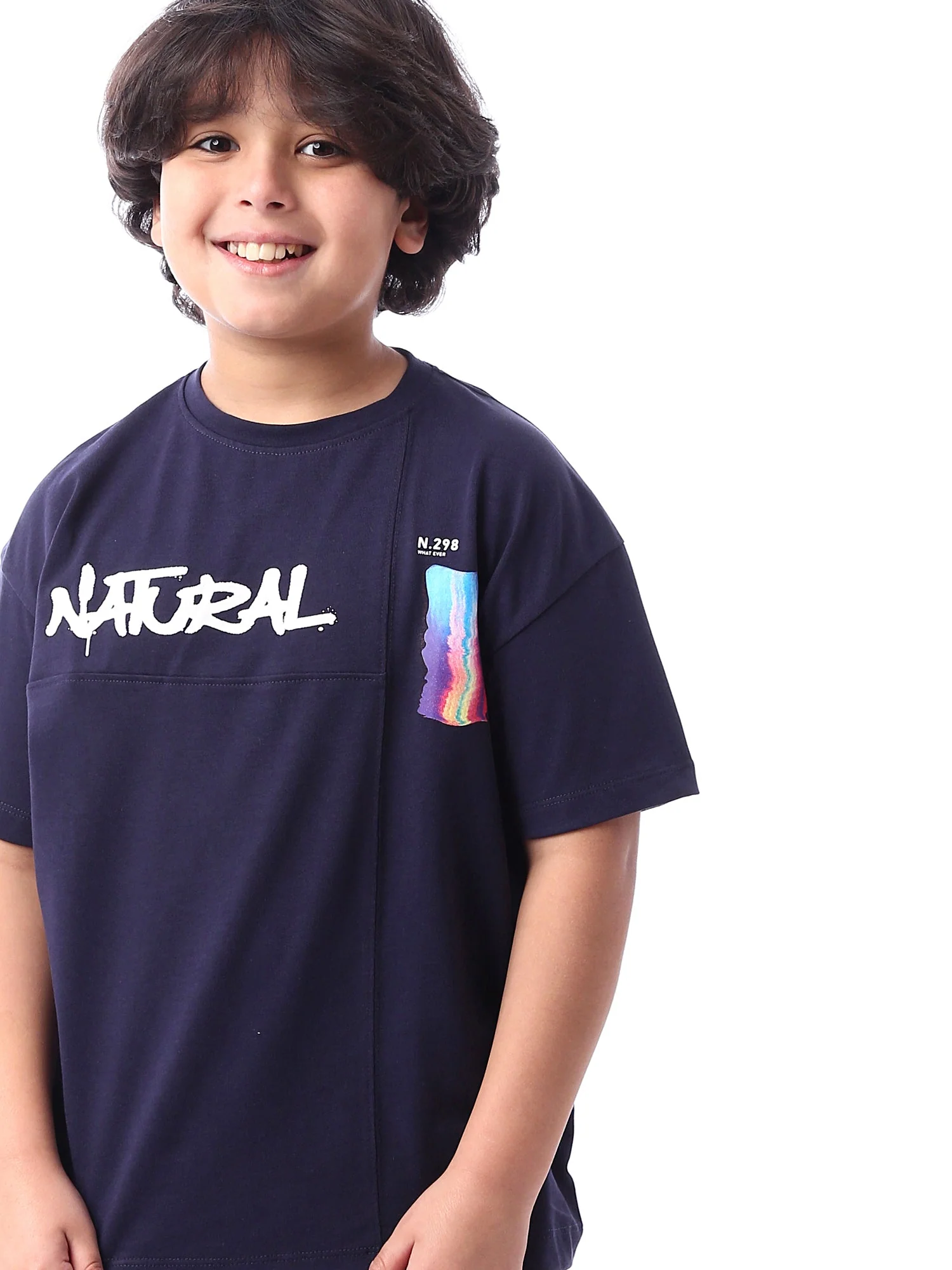 T-shirt pour garçon bleu foncé avec une impression sur le devant. Ce t-shirt présente un design moderne avec des couleurs distinctives. Il est parfait pour les enfants qui aiment les vêtements à la fois confortables et tendance. Idéal pour les activités quotidiennes ou les sorties estivales.