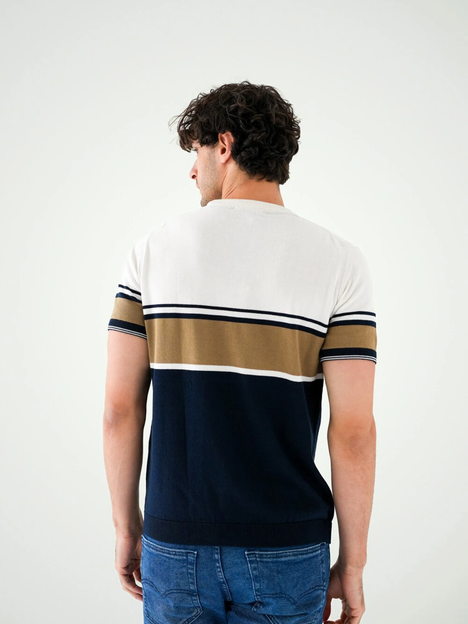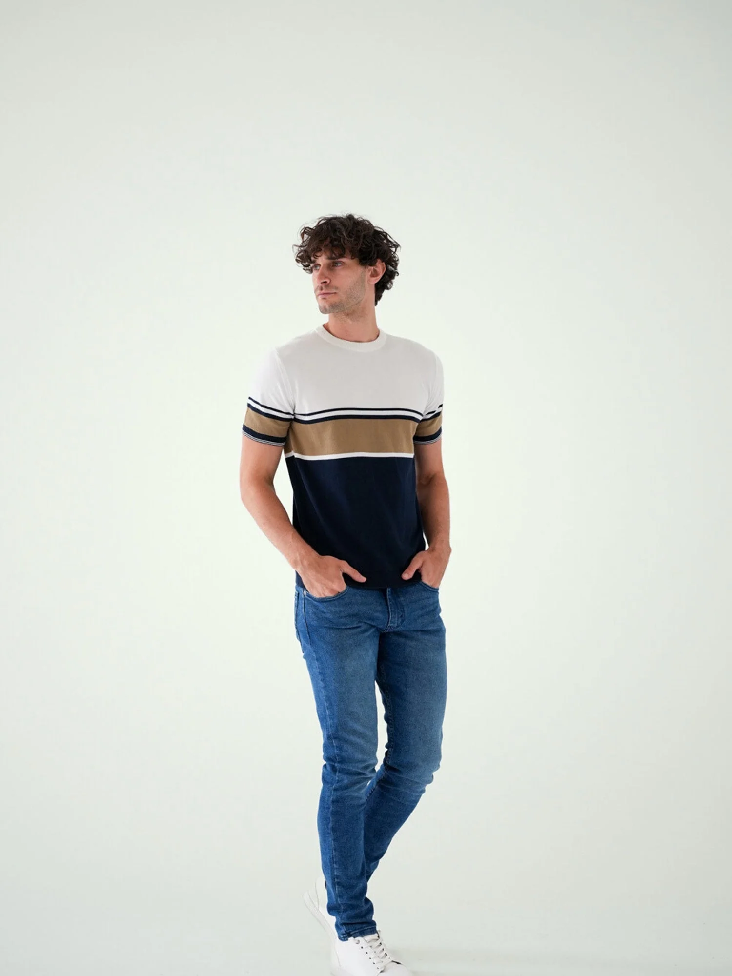 T-shirt pour homme moderne combinant les couleurs beige et bleu foncé avec des rayures horizontales élégantes. Ce design classique se distingue par la qualité de son tissu et son confort tout au long de la journée. Que vous le portiez lors de journées ordinaires ou pour des occasions décontractées, il ajoutera une touche d’élégance à votre look. Fabriqué dans un tissu confortable, il est parfait pour les atmosphères estivales et printanières.