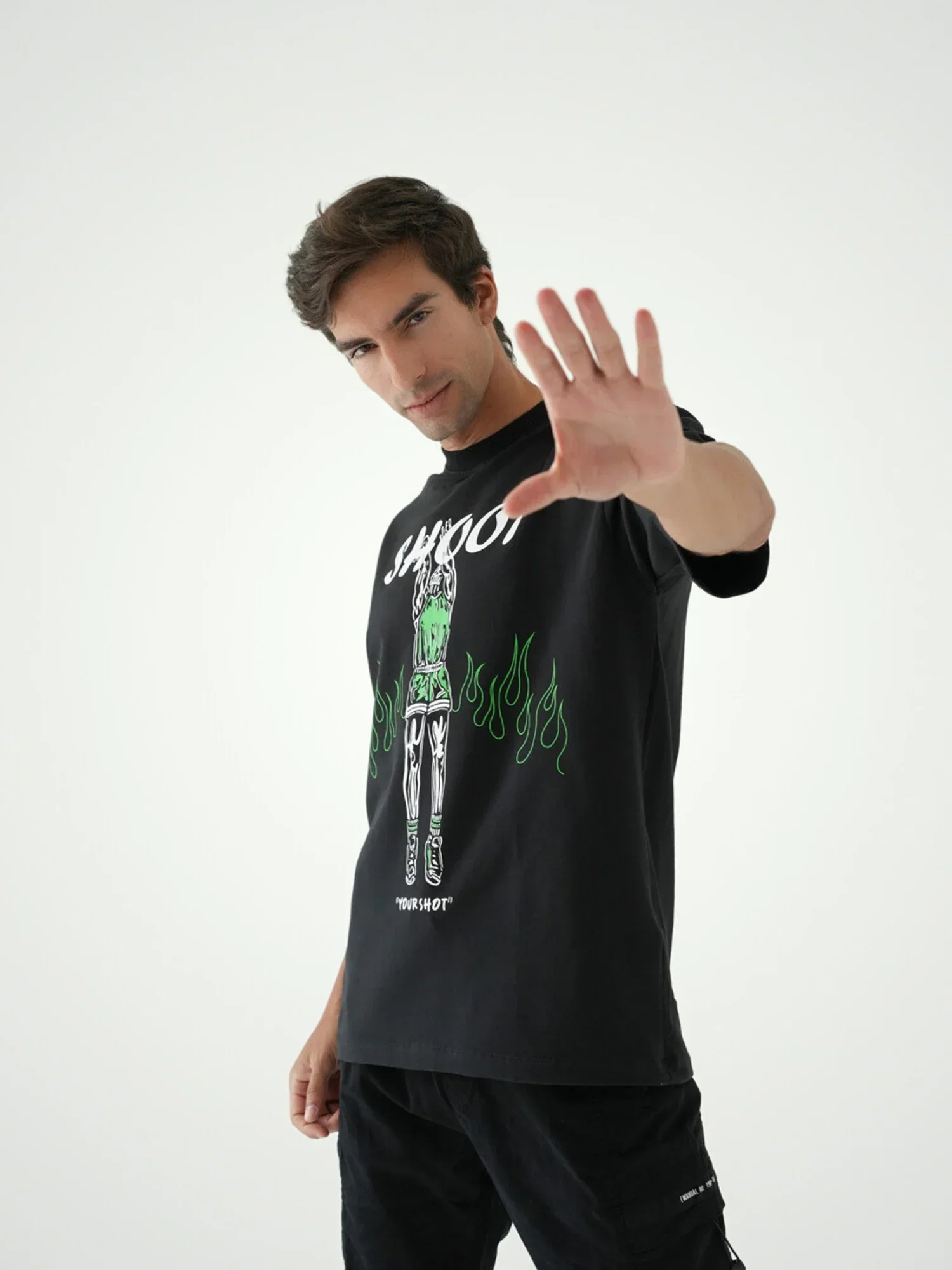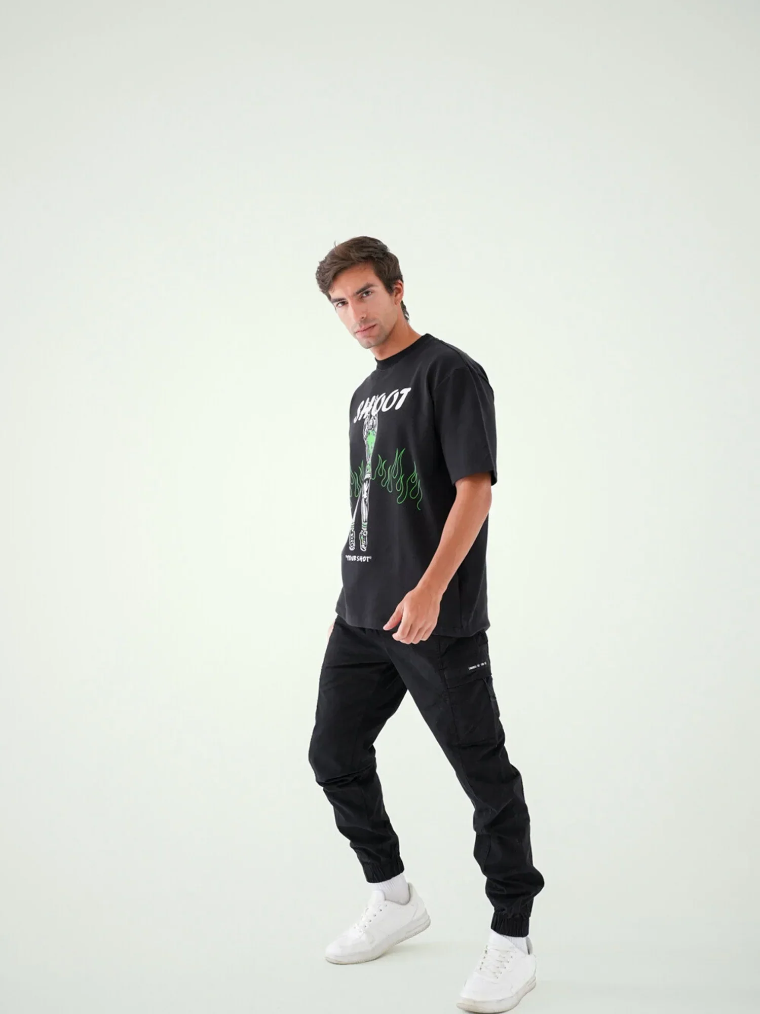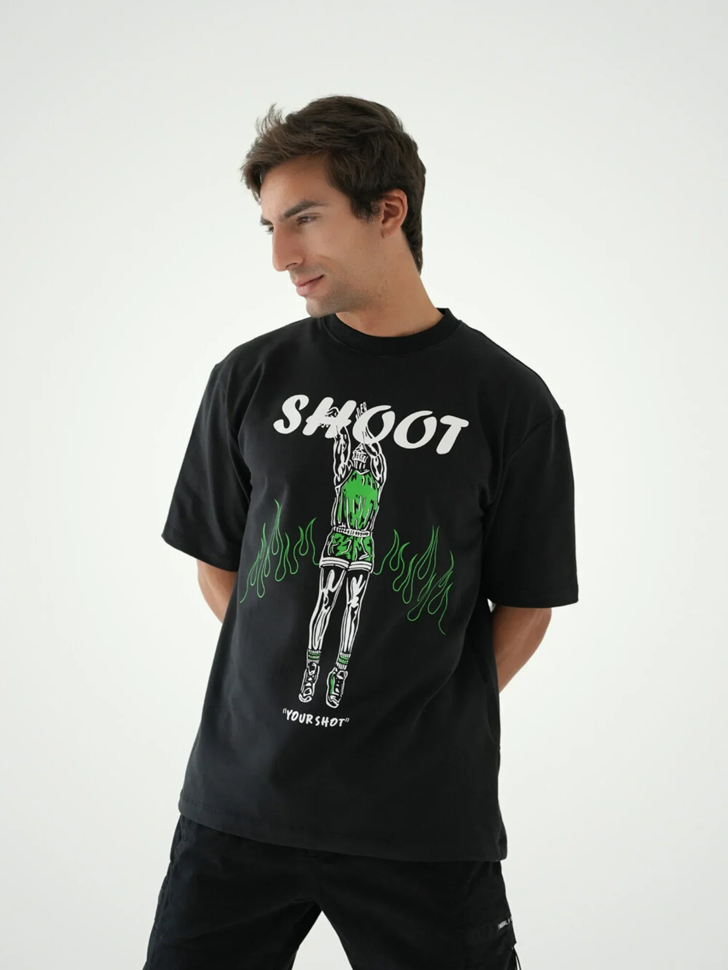 T-shirt pour homme noir au design moderne et attrayant, décoré d’un dessin « Shoot » avec des détails sportifs impressionnants. Le design présente une figure sportive en tenue de sport avec des effets de flammes vertes, ajoutant une touche de dynamisme et d’énergie. Fabriqué en tissu confortable, il offre à la fois confort et flexibilité pendant les mouvements. Parfait pour un look sportif décontracté, que ce soit pour des activités quotidiennes ou récréatives.