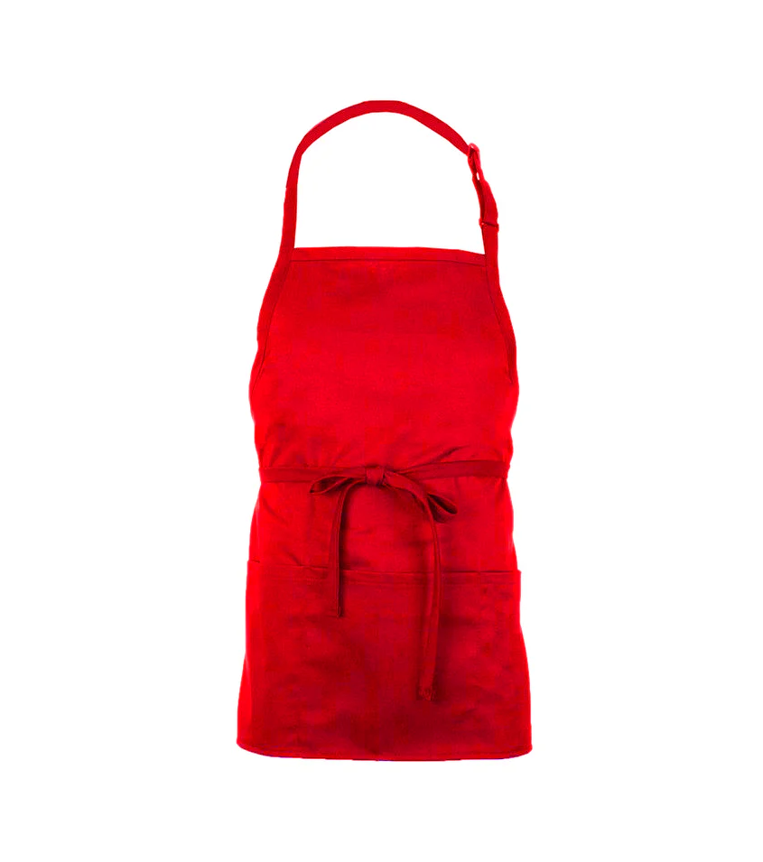 Tablier court à bavette, ajustable au cou, 27 po de large X 24 po de long, grande poche séparée en trois au bas du tablier.