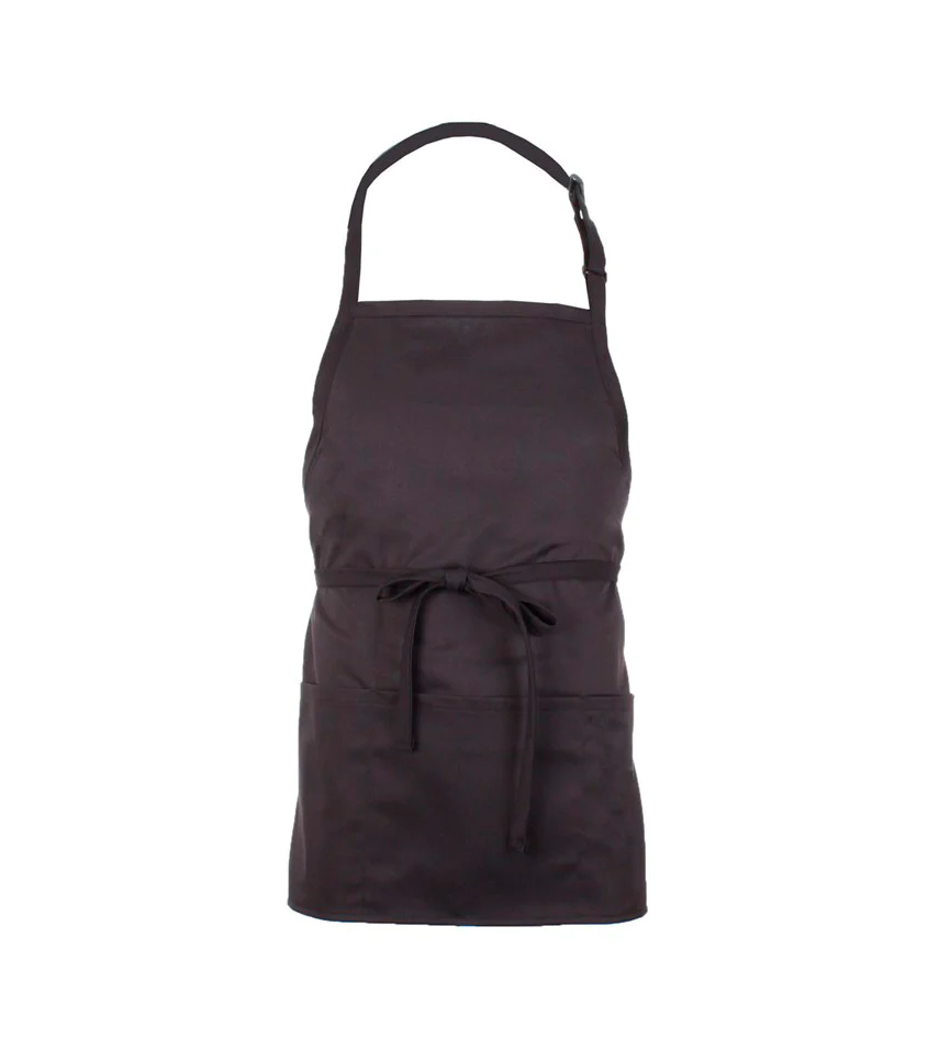 Tablier court à bavette, ajustable au cou, 27 po de large X 24 po de long, grande poche séparée en trois au bas du tablier. Tissu: 65/35 polyester/Coton Twill 7.25-oz.