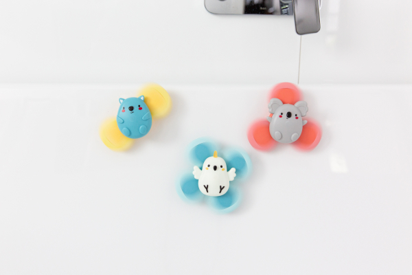Un atout pratique majeur : chaque animal est équipé d’une ventouse puissante permettant une fixation simple et stable sur toutes les surfaces lisses et non poreuses. Baignoire, carreaux, chaise haute, miroir, réfrigérateur ou encore vitre de voiture : les spinners trouvent leur place partout et garantissent un jeu indépendant sécurisé.