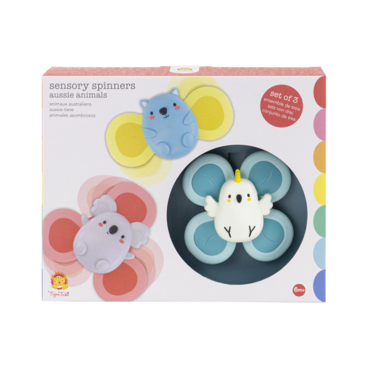 Chaque spinner représente un adorable animal australien : un Cacatoès, un Koala et un Wombat. Chacun est muni d’une toupie à deux, trois ou quatre palettes, permettant ainsi de varier les sensations et les mouvements. Les formes arrondies et les textures en relief invitent les petites mains à explorer et à toucher, tout en renforçant la motricité fine et la coordination œil-main. À chaque mouvement, le spinner émet un bruit de hochet, renforçant l’apprentissage de la relation cause à effet.