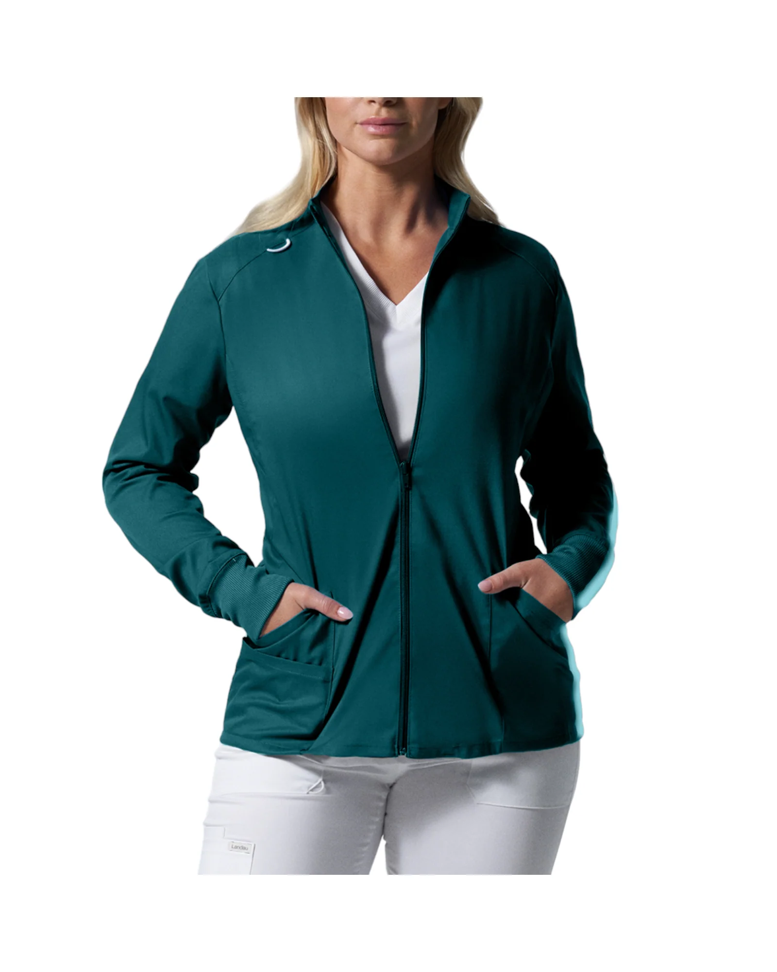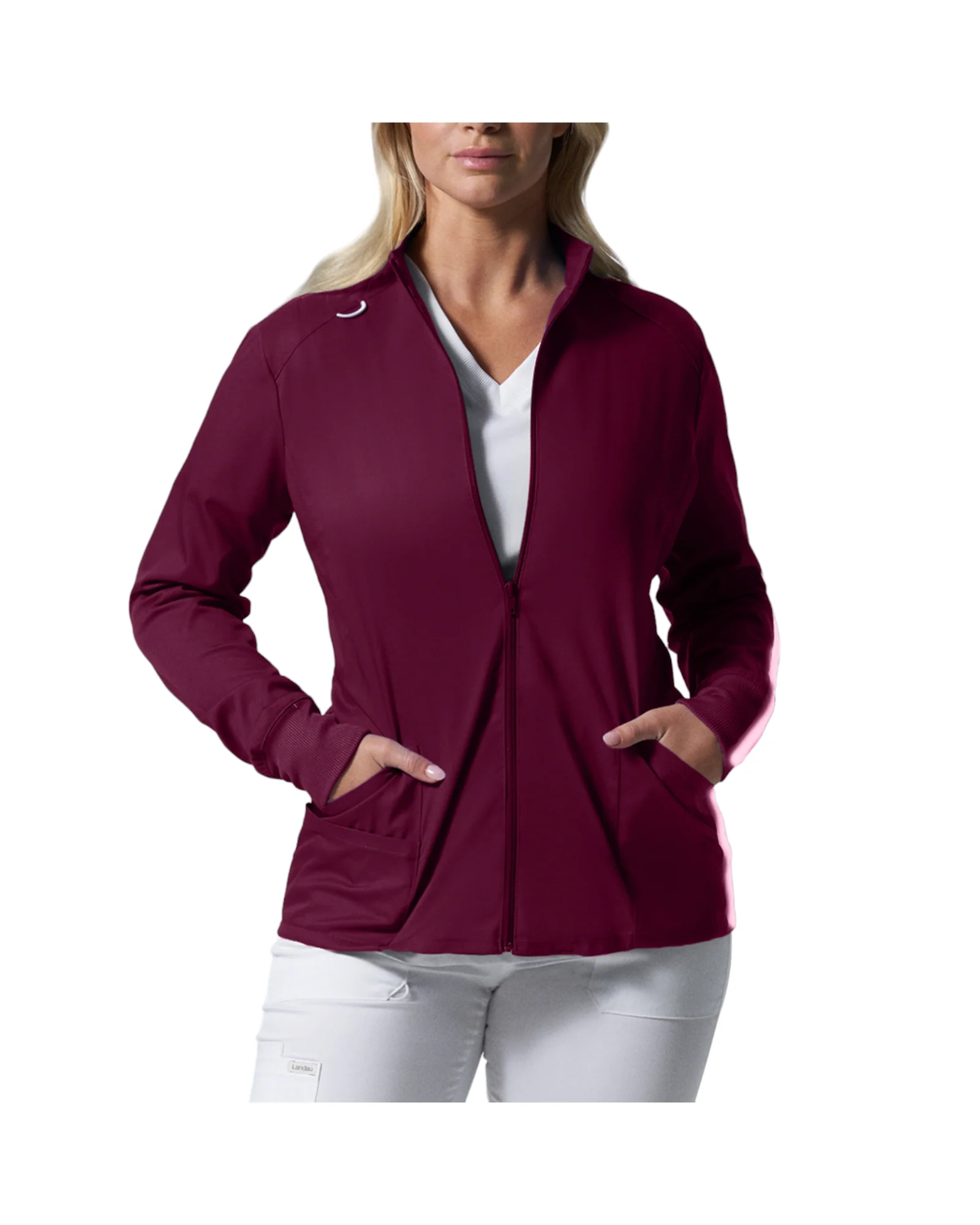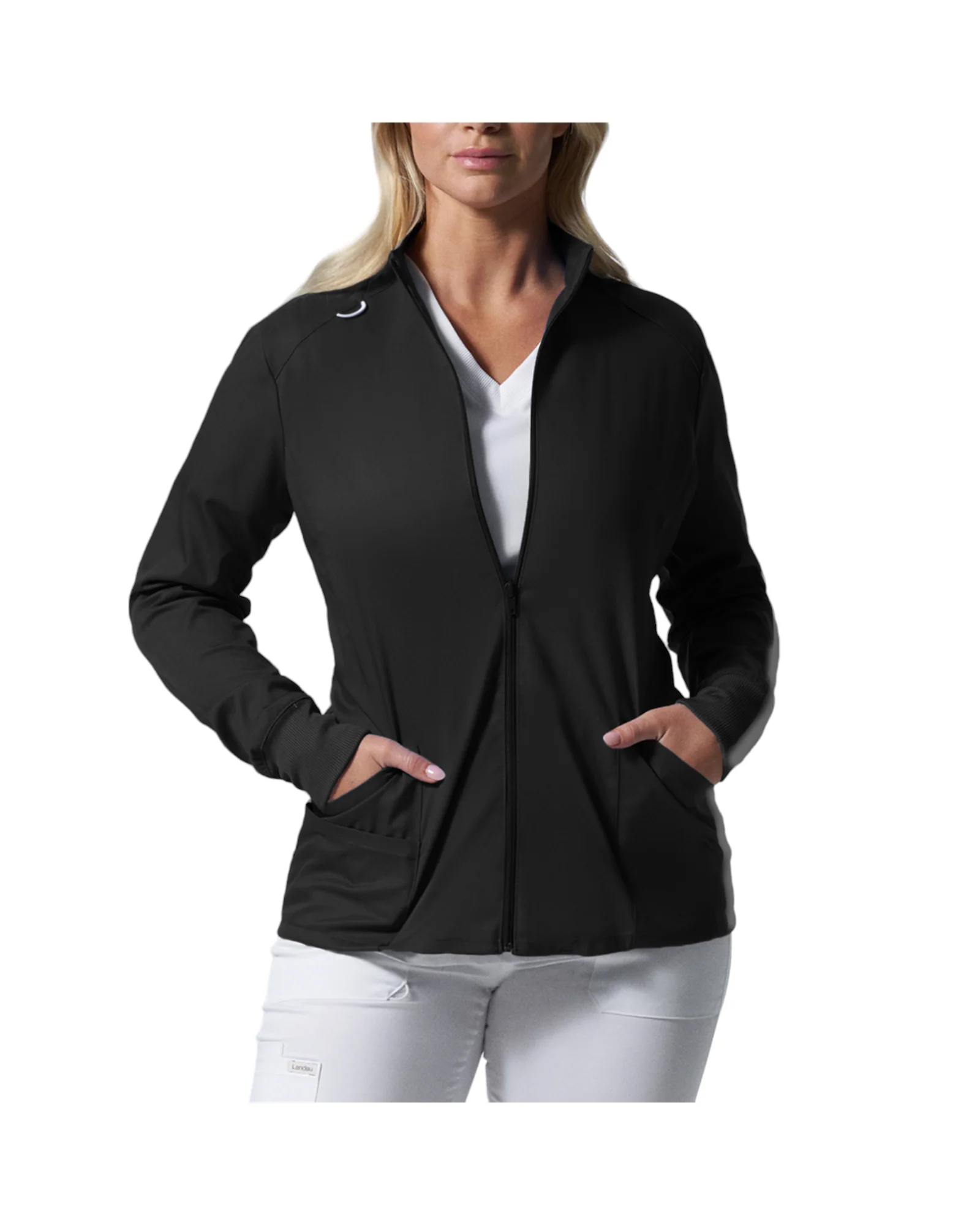 Restez au chaud avec cette veste de coupe contemporaine ! Coutures princesse à l’avant et à l’arrière, poignets en tricot côtelé, col montant, boucle pour badge, 2 grandes poches et 1 petite avec une boucle élastique dissimulée pour petits accessoires. Cette veste versatile est pratique tant au travail qu’à la maison tous les jours !