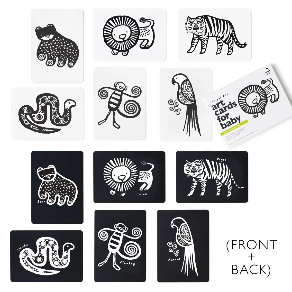 Cartes d’art de la jungle pour bébé. Les bébés sont fascinés par les dessins en noir et blanc. Les six adorables animaux de cet ensemble comprennent un lion, un serpent, un perroquet, un singe, un tigre et un ours. Chaque carte de 5″ x 7″ est magnifiquement finie avec une stratification mate et des coins arrondis adaptés aux enfants.