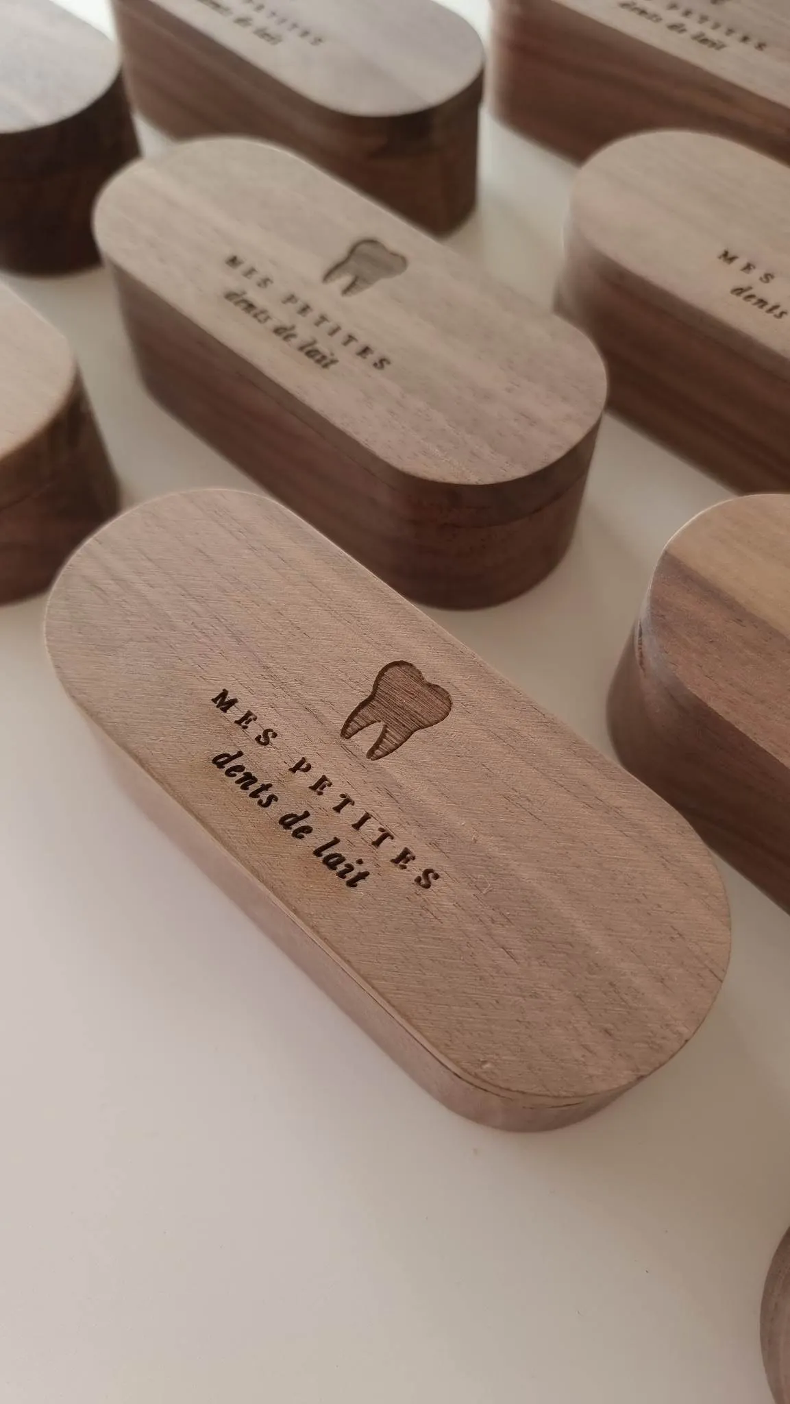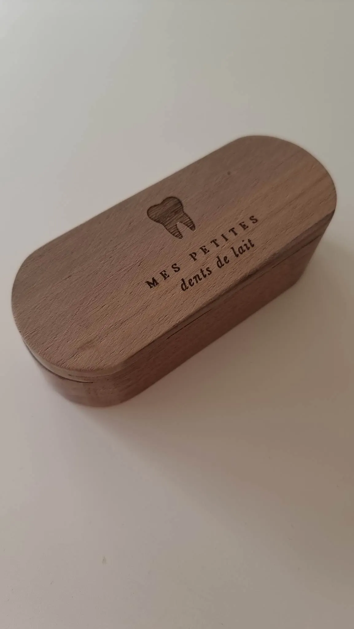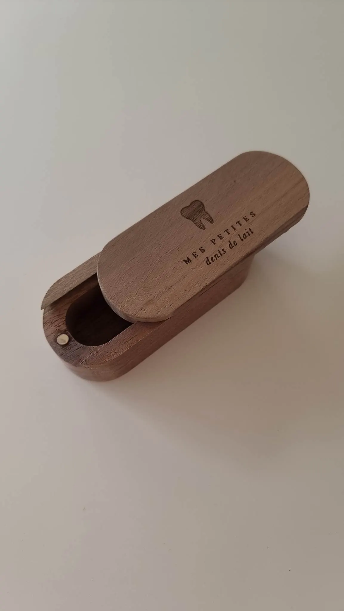 Cette jolie boite en noyer massif vous permettra de ranger les dents de lait de bébé.