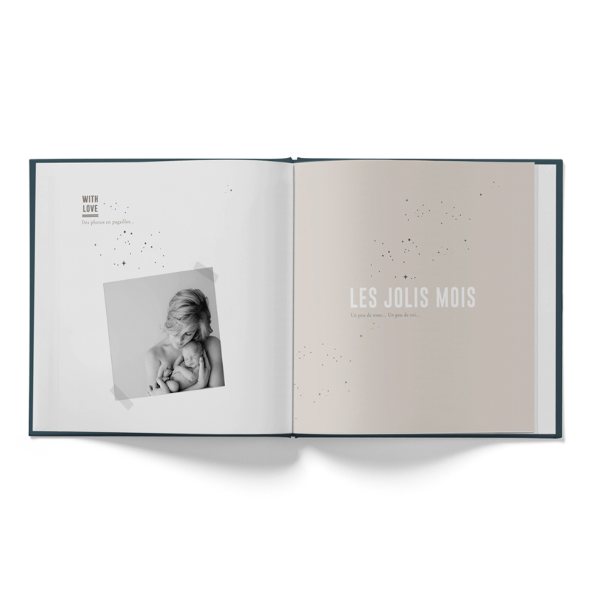 Intérieur papier 170g. Couverture reliure dos carré cousue. Couverture mat + dorure. Pochon en coton 25 x 30 cm. Intérieur· Avant toi (l’histoire de papa et maman…)· L’annonce (à ton papa, à ta famille…)· La grossesse (les échographies, mois après mois, fille ou garçon, baby shower…)· Welcome ! (récit de ta venue au monde, les premières rencontres…)· Mois par mois (ton évolution, les petites anecdotes…)· Tes premières fois (balade, repas, quatre pattes,…) Les Jolis trésors (histoire de dents, histoire capillaire, tes empreintes…)· Ton arbre généalogique· Des photos en pagailles· Quelques petites notes précieuses