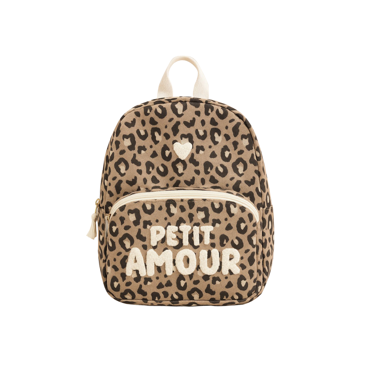 Adorable sac à dos “Sauvage” au motif léopard et broderie Petit Amour, parfait comme premier sac pour la crèche ou la maternelle. En 100 % coton, avec pompons amovibles, il offre une taille idéale (26 x 30 x 8 cm) pour transporter doudou, goûter ou gourde avec style.
